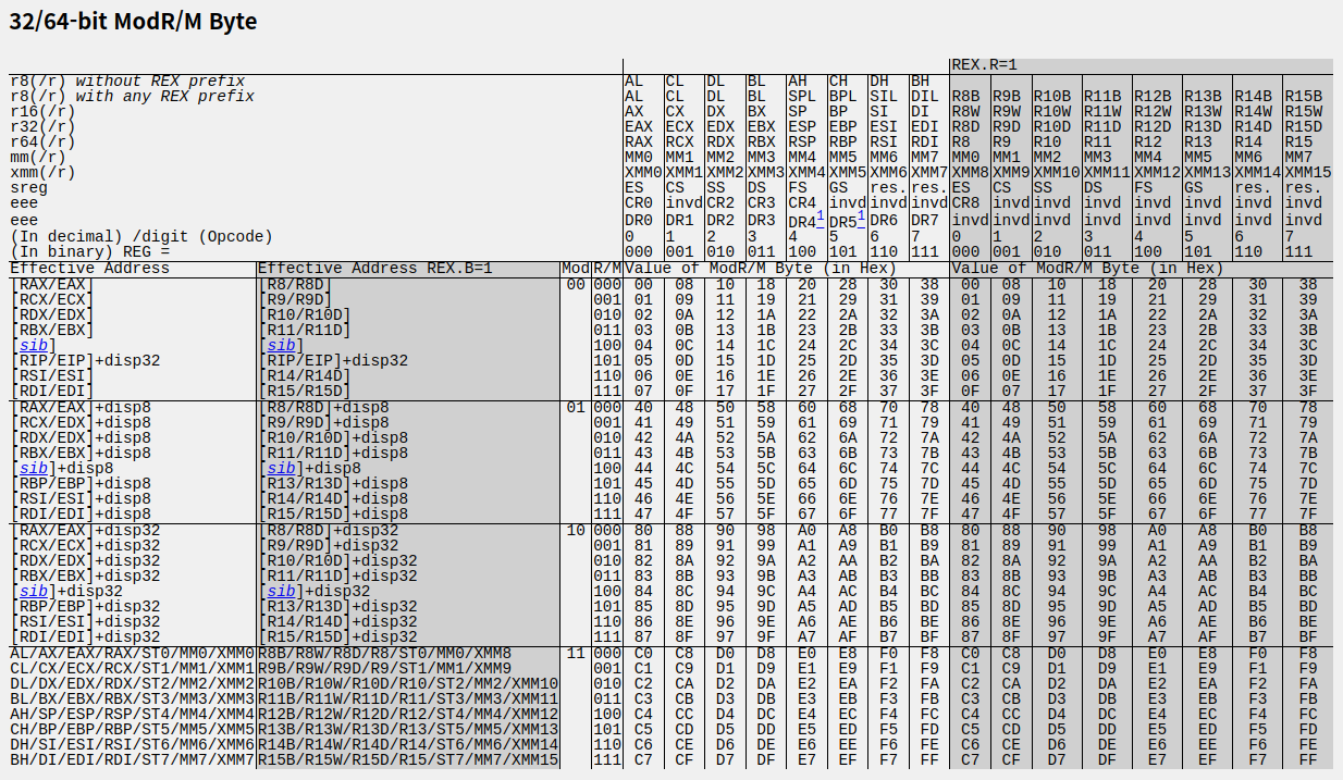 REX의 경우 매우 간단한 구조를 가지고 있으며, ModR/M표와 SIB표를 이용하여 쉽게 해당 비트를 구할 수 있다.